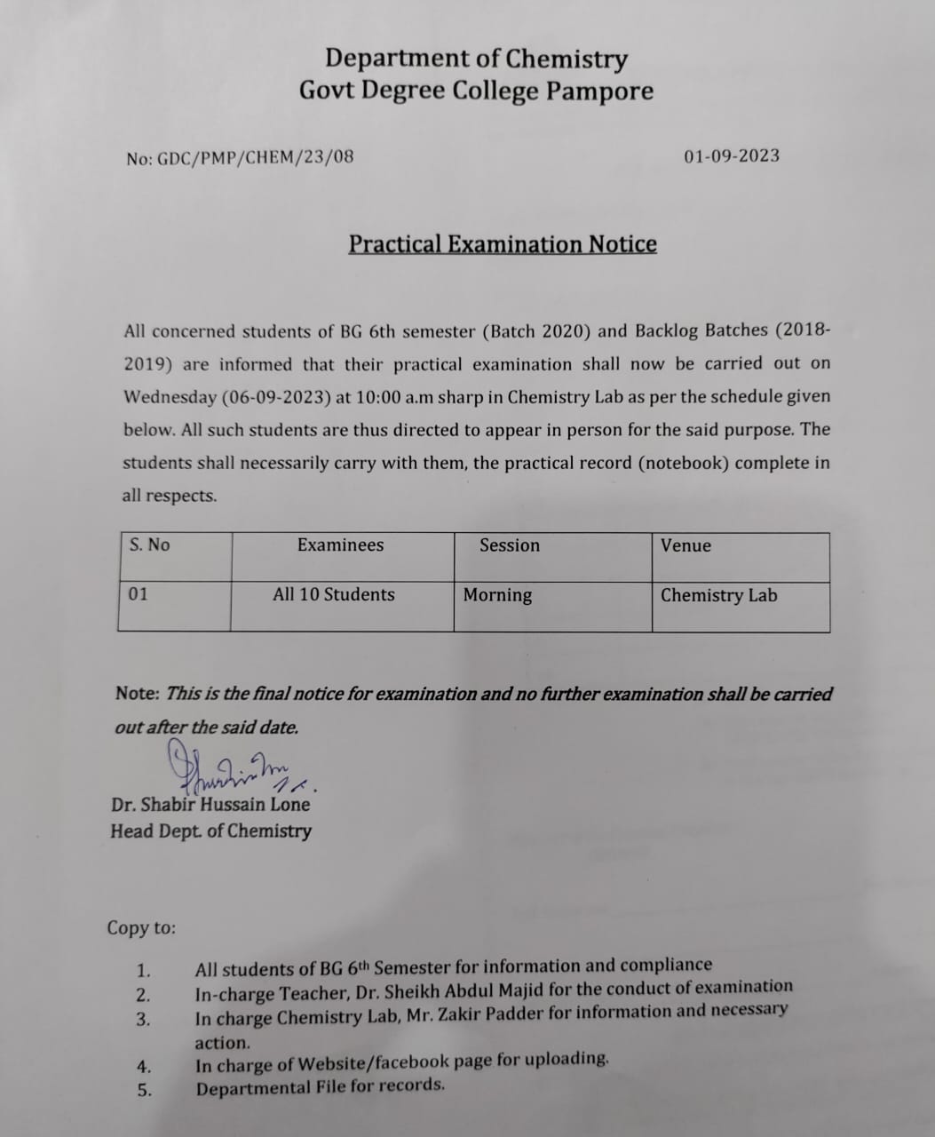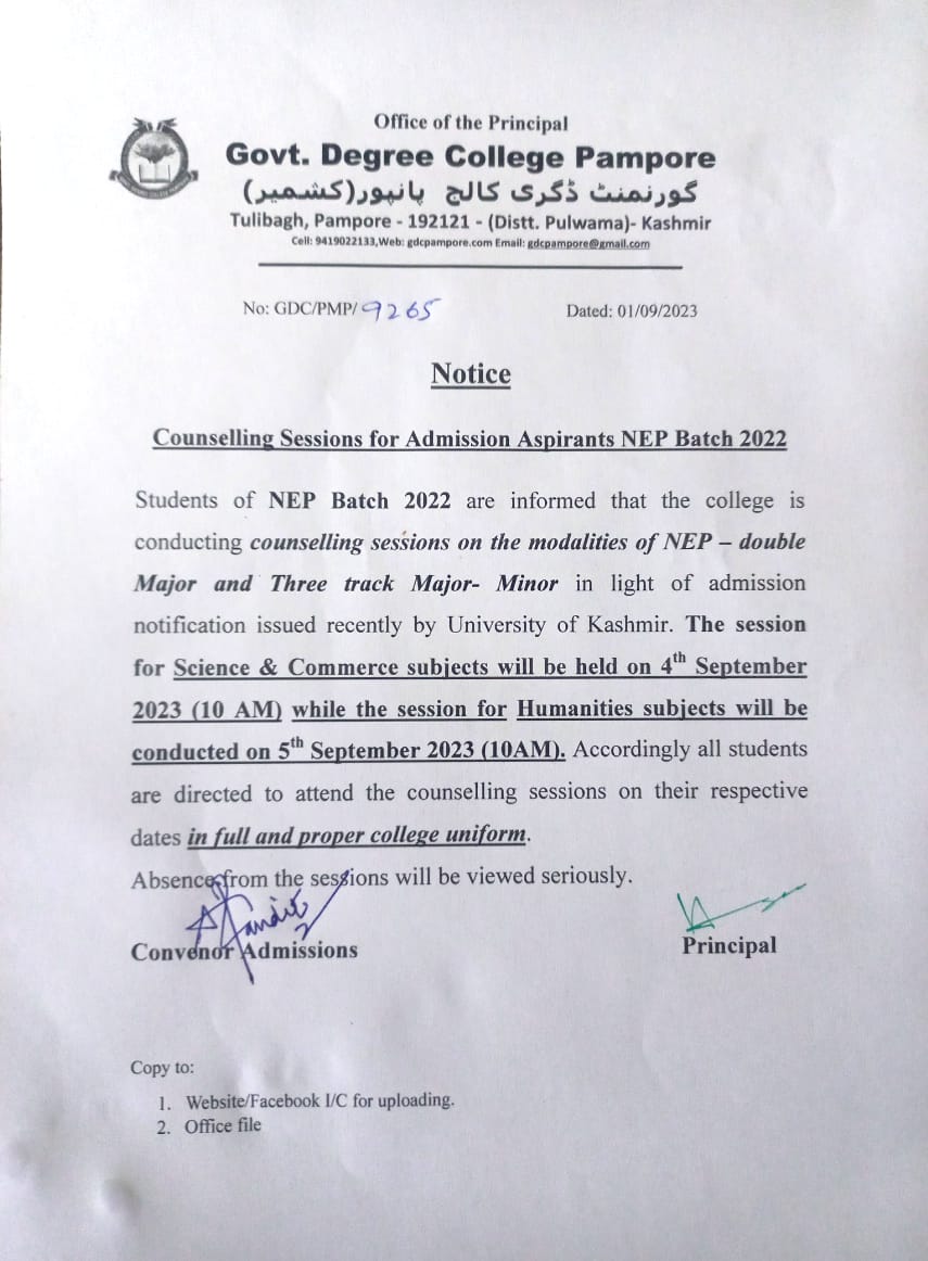 Govt. Degree College, Pampore was established in 2011 and is affiliated to University of Kashmir. Presently the college offers B. Sc, B. A., and B. Com following CBCS curriculum. In these past ten years the college has grown rapidly. Infrastructural expansion has taken place in terms of computer lab., smart classroom, browsing centre, adding one more floor to Library, automation, well equipped Gymnasium, Multi- Purpose Hall, Laboratory Block, Cafeteria and a cricket field.